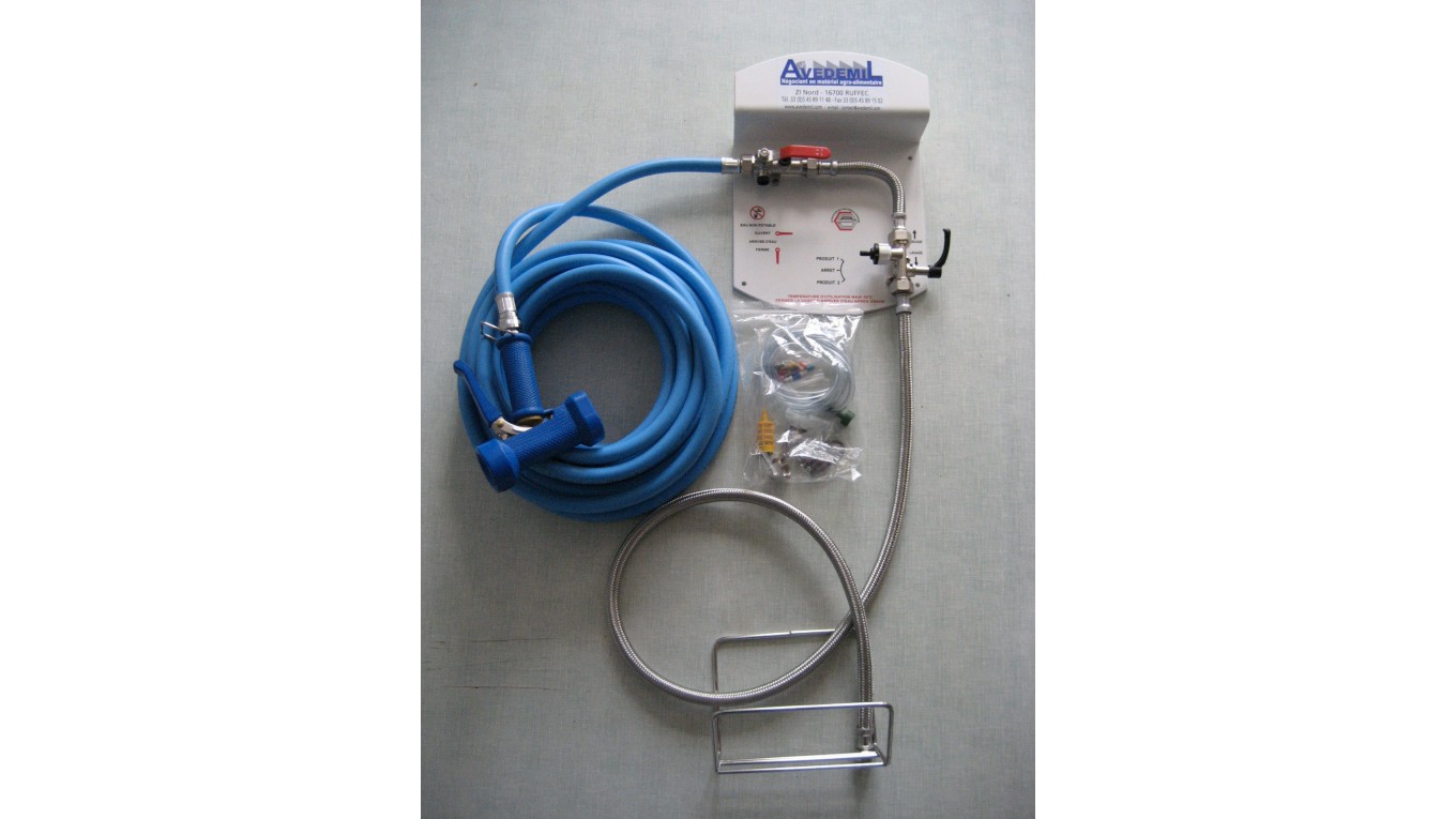 En mode lavage, le système dose le produit raccordé (bidon de 5 ou 10L), placé sur le support inox ; la fixation est murale.